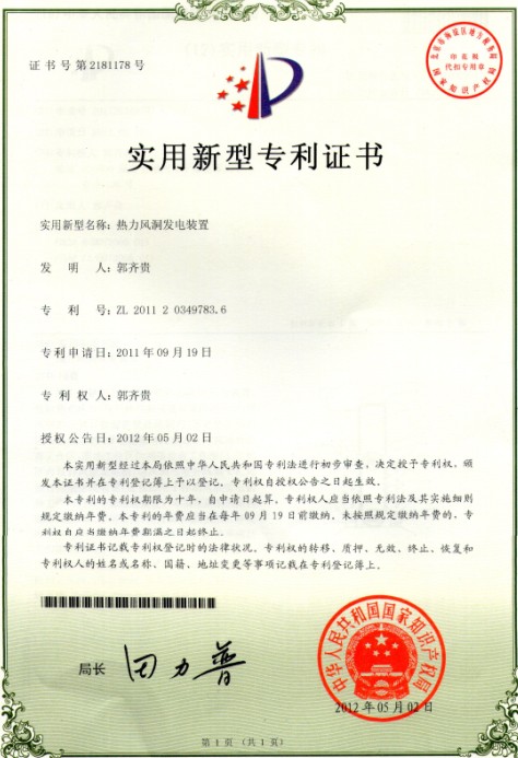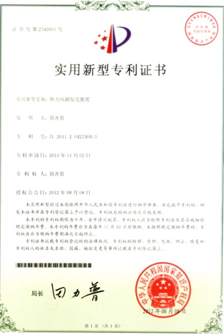 热气流风力发电站,是从适当高度的山顶平台向下凿建竖井,在竖井顶部向上浇注中空锥形风筒,沿竖井底部周围建造若干L形进风洞,进风洞切向连通竖进底部,竖井、风筒和进风洞构成发电塔;竖进底部设置热气流生成集成装置;本项目主体结构由发电塔、热气流生成装置、发电机组组成。热气流生成装置的热源由太阳能集热棚结合项目所在地的垃圾产生的沼气或小水电能、工业余热废气、地热能等构成,通过给竖井内的空气加热,在发电塔内狭管效应、梯度温差、龙卷风效应和各种热源共同作用下,实现电站连续发电。 热气流风力发电站根据热源种类的不同可形成多种发展建造模式,具有广阔的开发前景。 ㈠太阳能与垃圾结合:垃圾是“被放错地方的资源”。要实现垃圾无害化、减容减量化、完全资源化处理的总目标,应由通常销毁方法向多种方法、互助配合、共同处理的综合处理转变。利用项目所在地的垃圾综合处理所产生的沼气、不可回收的可燃物和太阳能集热装置产生的热气流来为热气流风力发电装置系统提供充足的热源,让热气流风力发电站能够持续、稳定的运转发电。 ㈡太阳能与小水电结合:利用项目所在地的小水电站所发的有限电能与太阳能集热装置产生的热气流为热气流风力发电站提供热源,既可突破小水电升级扩容瓶颈又能将有限的水能转换成倍增的风能。 ㈢太阳能与工业尾气余热结合:利用项目所在地的工业余热或天然气脱硫厂的尾气与太阳能集热装置产生的热气流为热气流风力发电站提供热源,既为工厂处理了废气又为热气流风力发电站提供稳定热源,节能减排、一举多得。 ㈣太阳能与地热能结合:地热能的开采技术日趋成熟,利用项目所在地开采出来的地热能和太阳能集热装置联合为热气流风力发电站提供发电所需的可再生清洁热源,是一种很好的选择。 ㈤太阳能与“发电草”的结合:巨菌草(也称“发电草”),每亩年实收鲜草45000公斤,可发的电量44500度,相当于3.5吨原煤的发电量,如果用于为热气流风力发电站提供热源,将会获得更可观的综合效益。 热气流风力发电项目示范性工程的建造实施,可取得以下预期成果及综合效益: 1)标志着十二五期间国内又创造出一种新型绿色能源-“热气流风力发电”的诞生。 2)进一步完善“热气流风力发电”装置的各构成系统设计、建造技术规范。 3)定型“热气流风力发电”装置量产、复制、推广类型、技术参数及方案。 4)全天侯运行-本热气流风力发电装置可全天侯运行,无论是春夏秋冬、白天黑夜、还是风大风小,热气流风力发电装置均可安全顺利运转。 5) 可靠性强-热气流风力发电装置结构简单、操作简便,运行平稳、防护力强,运转可靠、故障率低。 6)应用范围广-热气流风力发电装置几乎适应于一切需要发电的区域使用,既符合平原、山地等普通地理环境下的发电要求,也符合盆地、丘陵、戈壁滩等特殊地理环境的发电需求,甚至在战争、灾害等复杂的背景下可独立、安全地对国防、民用重大战略设施提供电源保障。 7)市场庞大-热气流风力发电装置具有投资少、效益高、工作环境安静、无污染又清洁环保等优点,市场空间广阔,具有极高的经济价值和社会使用价值。 8)前景广阔,成果、效益显著-热气流风力发电装置具有原理可靠,设计简单,取材方便,运动部件少,维修方便,成本低,无环境污染,昼夜运行稳定,使用周期长等特点,成为国内外发展新能源的必然选择趋势,也是完善国内外太阳能热气流发电的优化升级方案,对人类环境的改善和电力行业可持续发展具有重要的战略意义。